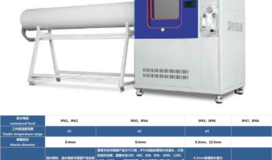 產品型號:IPX-1234 品牌:劍 喬 用途:可程式淋雨試驗箱適用于電工電子產品(包括組件)、燈具照明產品、汽車摩托車零部件外殼和密封件等產品做外殼防護等級測試(IP 防水等級試驗)